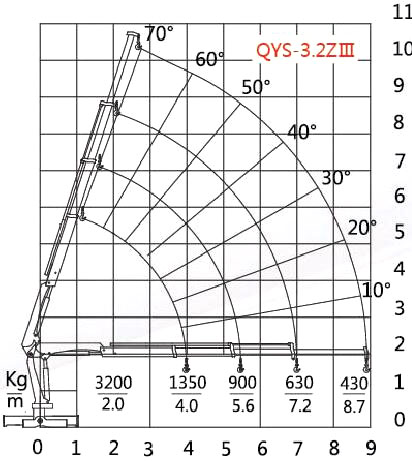 Lifting capacity at different working radius: 3200/2.0, 1350/4.0, 900/5.6, 630/7.2, 430/8.7