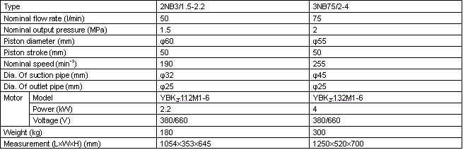 2NB Mud Pump Vertical double cylinders of three cylinders single action piston mud pump are applied to supply flush fluid during drilling casing hole or coal seam. The fluid can be mud water, coal water, or coal slurry with sediment concentration is less than 4% or pellet is not more than 2mm. They are mainly used to match with ZLJ series tunnel drilling fig for coal mine, or matching with water supply system.