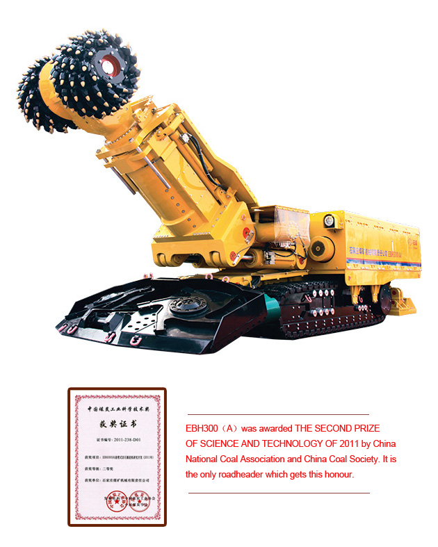 EBH300(A) Rock Tunnel Boring Machine Applications: for the tunneling of rock and semi-rock roadway, also used in the tunneling of highway, railway, and water conservancy projects. The cutting hardness is ≤13 Features: 1. Computer controlled, wireless remote-controlled, intelligent forming cutting and constant power cutting. 2. 125 tons weight to guarantee the stability and power during cutting. 3. Advanced centralized lubricating system to guarantee the reliability of every parts 4. High-efficient separate motor for loading and transporting, more suitable for rock roadway heading. 5. New design of apron, the first class of cutting pick and pick base to guarantee the rock cutting capacity.