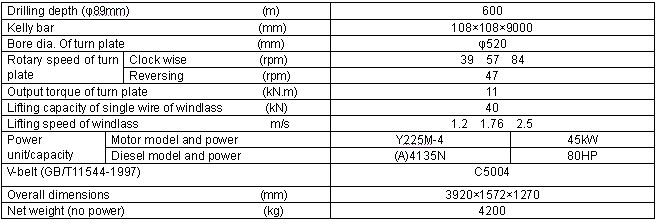 Drilling machine adopts mechanical transmission and turn plate structure with characteristic such as simple structure, reliable transmission, safety operation, and easily maintenance, etc. At the same time, it is with cat head to assembly or disassembly the drilling tools instead of bushing retainer.