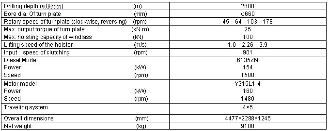 Characteristics It is characterized by mechanical transmission, turn plate rotation, low center of gravity, smooth transmission of motion, reliable operation and perfect sealing, the structure of the drill is reasonable arranged, and easy to maintain and repair, It adopts up or down cushion fork or cylinder twisting deduction or cat head to disassembly drilling pipes.