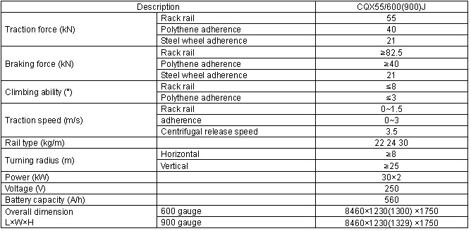 CXQ55/600 (900) J-type battery track rail locomotive is powered by a special explosion-proof battery mechanical transmission self-drive locomotives for 8 ° slope in the underground roadway. It can realize the continuous direct transport of materials, personnel, equipment from the shaft bottom to the work area. The locomotive is powered by high-capacity battery, DC motor traction, with features of big traction force, long distance transport, good climbing ability, low failure rate, no pollution, small noise, and low operating costs.