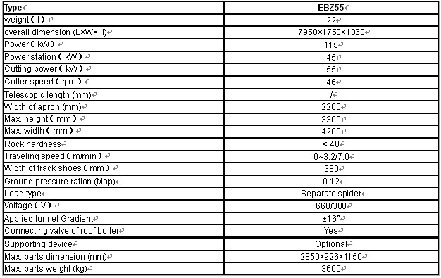EBZ55 Road Header is a kind of jib armed, lengthwise direction tunneling machine with the functions of cutting, loading and traveling, suitable for the coal or half coal tunnel.