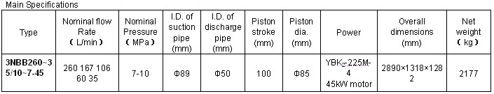 It is a kind of single-acting and three-cylinder pump with crank and connecting rod mechanism. Being lip-shape and self-sealing, the pressed piston is made of rubber and nylon cushion. The pump can get four flow rates with an automobile gear box. An anti-knock pressure meter, necessary spare parts and assembling tools are provided with the pump together.